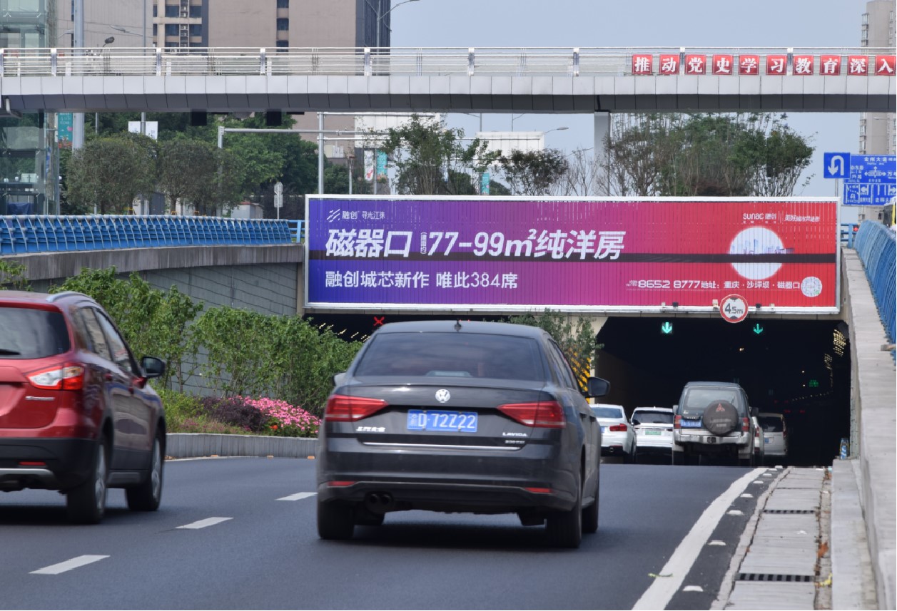 媒體位于金開大道愛琴海購物公園下穿道,周邊約有100萬常住客群,40多個高端住宅,核心輻射周邊5—10公里范圍內的家庭消費及商務人群、250萬人口;次級輻射渝北、江北等主城300萬商務人群。媒體位于下穿隧道兩端,離地近,面積大,可雙向覆蓋空港新城、鴛鴦、金州板塊至三北核心的上下班車流。