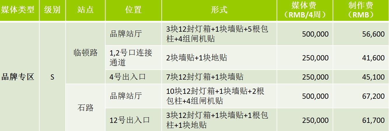12封燈箱每塊950元,屏蔽門貼面積根據(jù)所選廣告發(fā)布位置的實際面積計算制作費