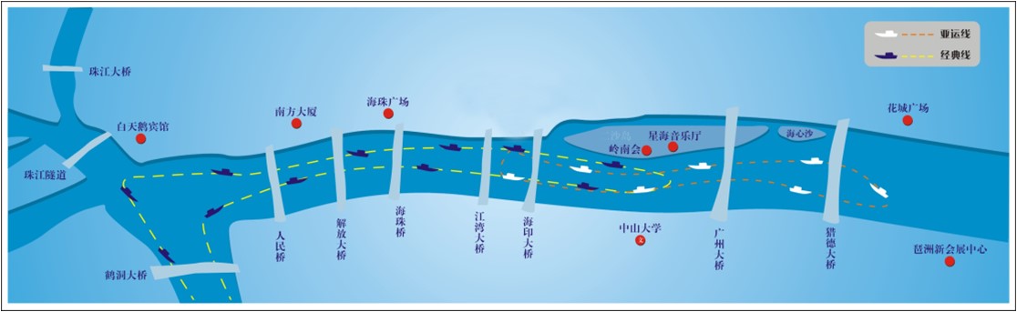 【亞運線】 大沙頭碼頭→海印橋→星海音樂廳→廣州大橋→廣州電視塔→海心沙→獵德大橋→琶醍→大沙頭碼頭