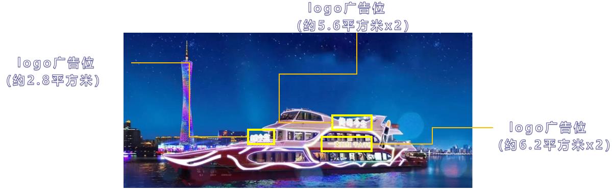 | 媒體尺寸 | 船身外側廣告字:長-7米、高-0.9米;船頭橫幅廣告位:長-10米,高-1米; 一樓內部整面廣告墻:長-3.4米,高-2.8米。 |