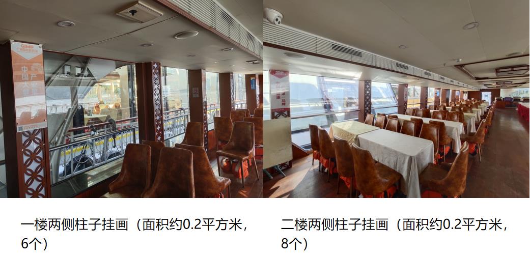 游船內部廣告位:一樓及二樓開放式坐席區兩側分布2個長條狀廣告展示位,共4個。