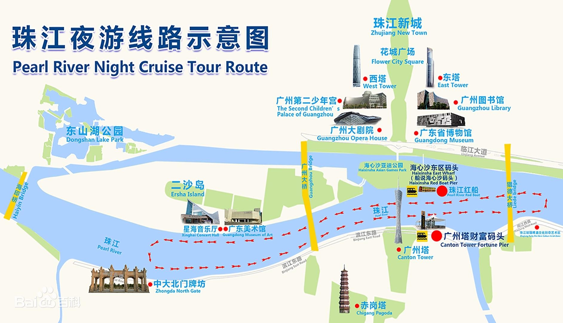 【常規全線】 大沙頭碼頭→江灣大橋→海印橋→解放橋→人民橋→白天賓館→白鵝潭返航海印大橋→星海音樂廳→廣州大橋→廣州電視塔→海心沙→獵德大橋→琶醍→二沙島→大沙頭碼頭