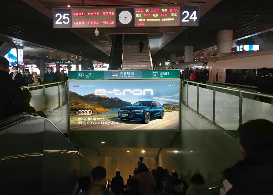 | 西安北站廣告 到達層出站通道墻面燈箱 · 2塊 媒體尺寸(寬x高x面):33㎡ ( 11m x3 m× 1面) 投放形式:1塊/組 媒體價值: 1、媒體位于西安北站到達層南出口通道內,該媒體可以輻射所有南出口的旅客; 2、媒體面積大,視覺沖擊力強,媒體覆蓋面廣,更能影響旅客注意力,強制性強。 |