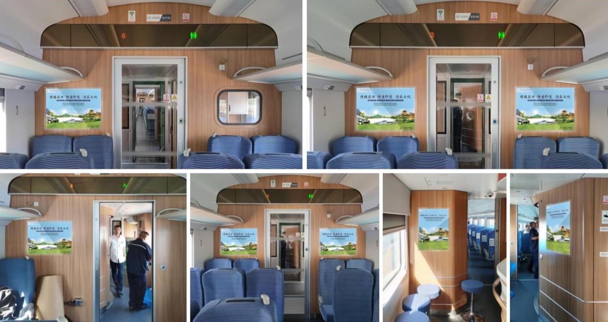 動(dòng)車組列車規(guī)劃27塊(規(guī)格為50cm×75cm),材質(zhì)為新型亞克力展板,采用膠貼方式安裝,無痕跡易清洗,具阻燃性和牢固性。