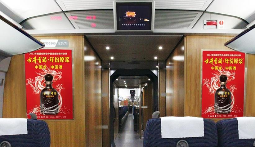 列車廣告的“數字媒體”,屬于視覺媒體、提示性媒體,反復增強旅客對品牌的印象。 乘客上車、下車、洗漱、前往餐廳的必見媒體。 用于整個列車的廣告冠名,如“暢達”(企業名稱),強勢彰顯企業實力。