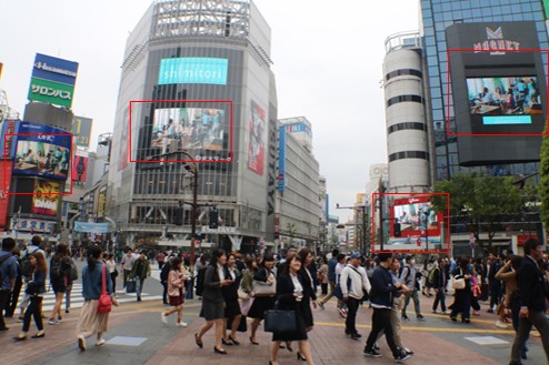 • Media size: Shibuya Eki-mae Vision: H16,320mm x W21,600mm Mighty Vision Shibuya: H5,600mm x W9,920mm Q eyes Main Screen: H7,280mm x W12,950mm ,Sub Screen: H5,320mm x W12,930mm Shibuya Television 2: H3,450 x W6,109 Forum Vision: H4,800mm x W8,640