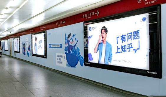 當然,知乎不滿足于現(xiàn)有用戶群體,在線上競爭日益激烈的今天,它將目光放在了能更快速傳播品牌價值的戶外廣告,乘坐地鐵通勤的用戶以其高收入、高消費的人群特點引起了知乎的注意。由于地鐵廣告形式種類繁多,選擇合適的廣告形式尤為重要,作為知名品牌的知乎,選擇了廣告面積巨大、效果更為震撼的地鐵品牌專區(qū)廣告形式,這種地鐵廣告形式能讓大家快速記住知乎這個品牌。