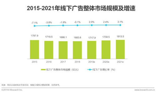 中國(guó)線下廣告因受到互聯(lián)網(wǎng)沖擊,整體規(guī)模在2015-2018年間呈現(xiàn)負(fù)增長(zhǎng)趨勢(shì),從1787.9億元跌落到1683.8億元。預(yù)計(jì)從2019年起,線下廣告整體規(guī)模將從負(fù)增長(zhǎng)回復(fù)至正增長(zhǎng),且增長(zhǎng)率將逐年提升。