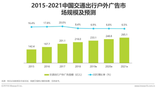 根據(jù)艾瑞咨詢數(shù)據(jù)顯示,2018年中國(guó)交通出行場(chǎng)景戶外廣告市場(chǎng)規(guī)模達(dá)218億元,同比增長(zhǎng)率為8.4%。艾瑞分析認(rèn)為,未來(lái)交通出行中戶外廣告的發(fā)展穩(wěn)定。一方面是因?yàn)榻煌▓?chǎng)所建設(shè)和人流量都有著穩(wěn)定的規(guī)劃和控制,且交通場(chǎng)所的商業(yè)化滲透率也較為飽和,因此從供給和需求上都不會(huì)產(chǎn)生大的變化;另一方面,由于交通場(chǎng)所的公共安全屬性,難以出現(xiàn)通過(guò)增加單位場(chǎng)所內(nèi)的廣告資源類型或數(shù)量來(lái)實(shí)現(xiàn)新的增長(zhǎng)。