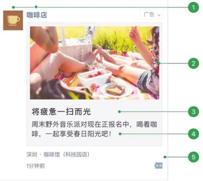 1. 廣告主頭像昵稱:用戶點(diǎn)擊可直接跳轉(zhuǎn)廣告主公眾號介紹頁;2. 外層圖片、小視頻;3. 外層文案標(biāo)題(可選);