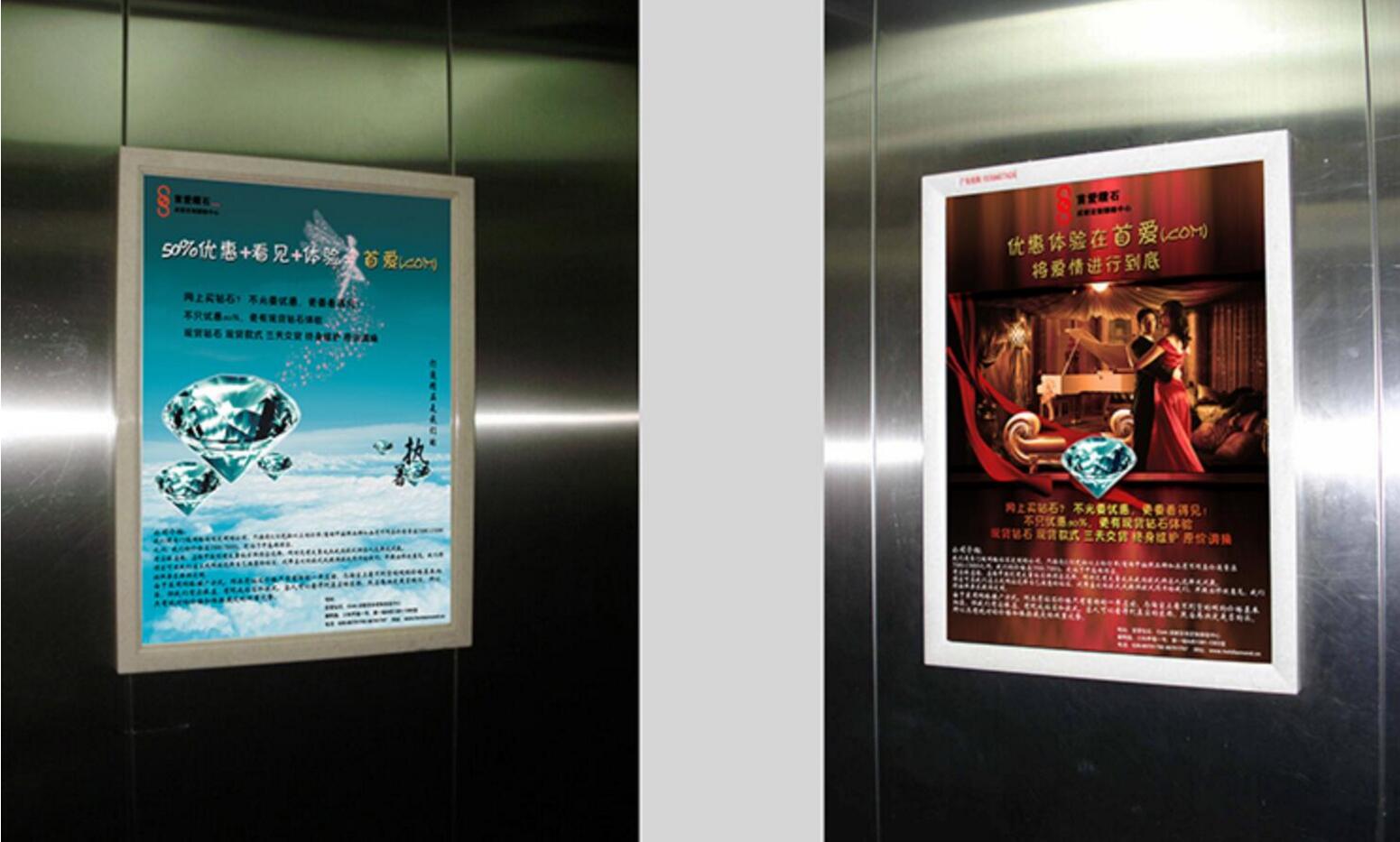 電梯廣告類型多樣,以商務(wù)電梯、樓宇電梯為主,表現(xiàn)形式主要為在電梯轎廂內(nèi)安裝成相框的形式,還有一種是在電梯門上直接安裝廣告。