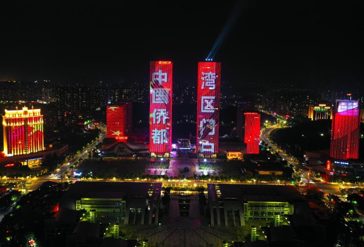 城市地標燈光秀廣告,廣東江門蓬江萬達雙子塔樓體燈光秀廣告