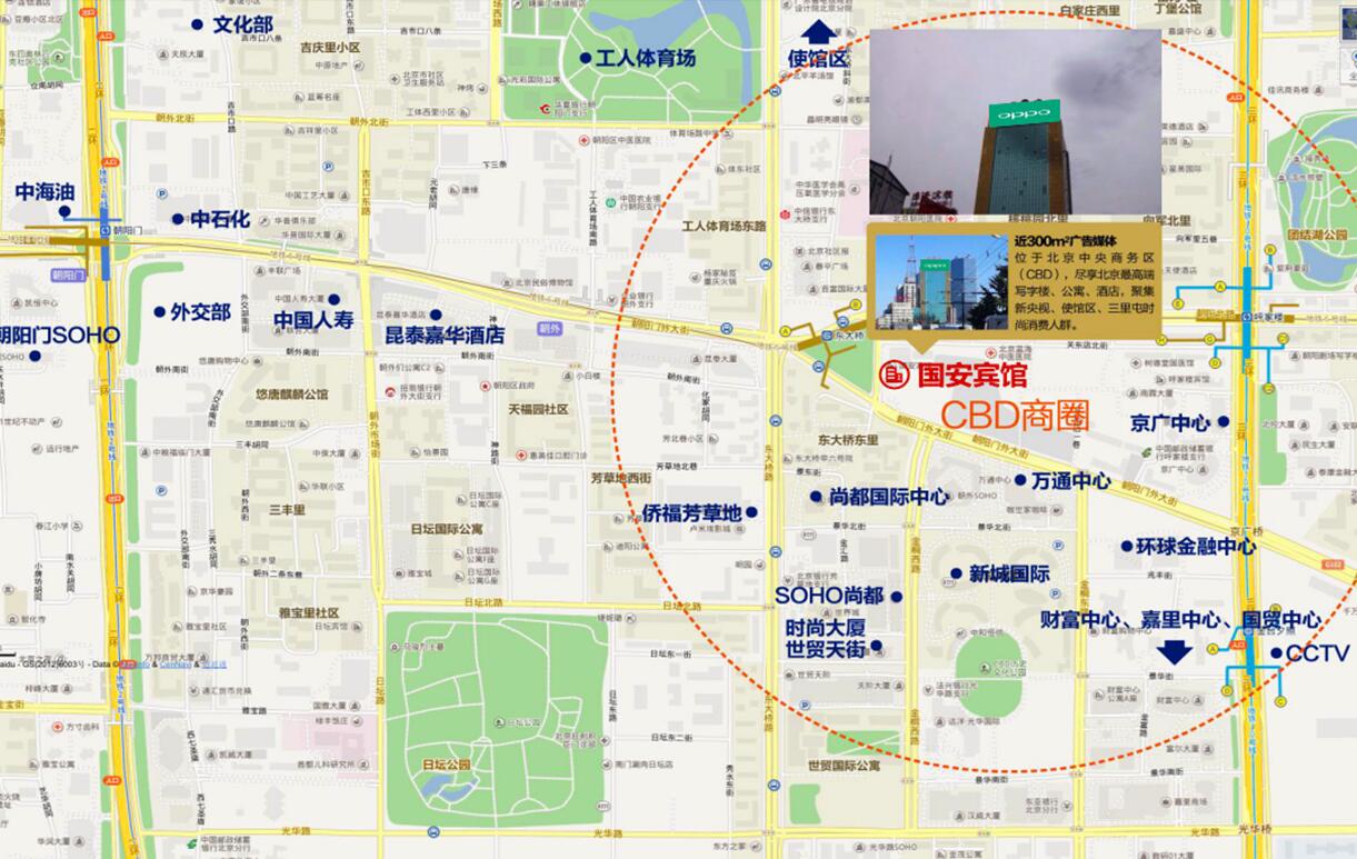 媒體效果、介紹:CBD國安大廈位于朝陽門外大街的黃金地段--朝陽門外大街關(guān)東店北街1號(hào)、中信國安大廈樓頂,直面工體東路、東大橋路、朝陽路、朝陽門外大街及朝陽北路交匯的五岔路口,地理位置優(yōu)越。