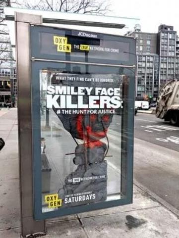現(xiàn)在已經(jīng)有很多案例表明不斷地有公司在研究更具體驗感、創(chuàng)造性的戶外廣告,比如在公交車候車亭創(chuàng)造出更為復(fù)雜的表現(xiàn)形式。就像下面這個候車亭廣告,為了宣傳驚悚電影《笑臉殺手(The Smiley Face Killers)》,采用透明的裝飾柜效果打造出一幅謀殺泰迪熊的場景,讓人汗毛豎立的同時,又忍不住想多看幾眼。