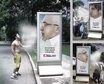 比如巴西QG公司為巴西著名藥品連鎖店Droga Raia創(chuàng)作的公益性廣告。通過在廣告箱里安裝的噴霧設(shè)備和巧妙的視覺設(shè)計,讓蒸汽就像噴嚏一樣從模特的鼻孔噴出。當人們懷著好奇走近時會看到:“流感就在空氣中。保護好自己。”下面是Droga Raia連鎖店的標志。好奇的路人可以躬身細看究竟,也可以伸臉體驗一下噴霧。