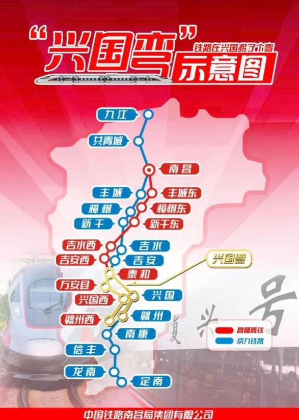 2019年12月26日,在贛南老區人民的熱盼中,京港高鐵的重要組成部分——昌贛高鐵開通運營。昌贛高鐵自北向南在萬安縣站引出后,幾乎呈90度向東延伸,把興國縣納入高鐵版圖。昌贛高鐵的“興國彎”使線路延長了40多公里,產生了兩座超過10公里的長大隧道(萬安隧道13.9公里,興國隧道10.4公里)。