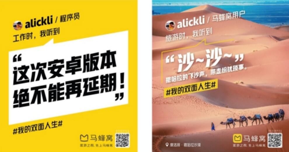 近日,北京地鐵1號線、2號線、10號線等十余條線路上,陸續(xù)出現了馬蜂窩旅游網的新版地鐵廣告。與近兩年常出現在人們視野中的標志性品牌黃略有不同,這次廣告的主角是馬蜂窩的用戶們。廣告以“我的雙面人生”為主題,詮釋了當代年輕人在工作中與旅途中展現出的不同自我,同時也體現出馬蜂窩作為一個年輕化旅游平臺的個性與多元。
