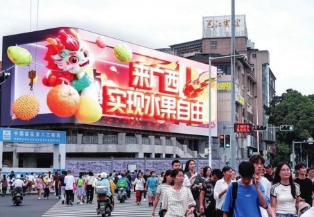 “來廣西實現水果自由”的宣傳片出現在中山路裸眼3D廣告大屏上,鮮活生動。
